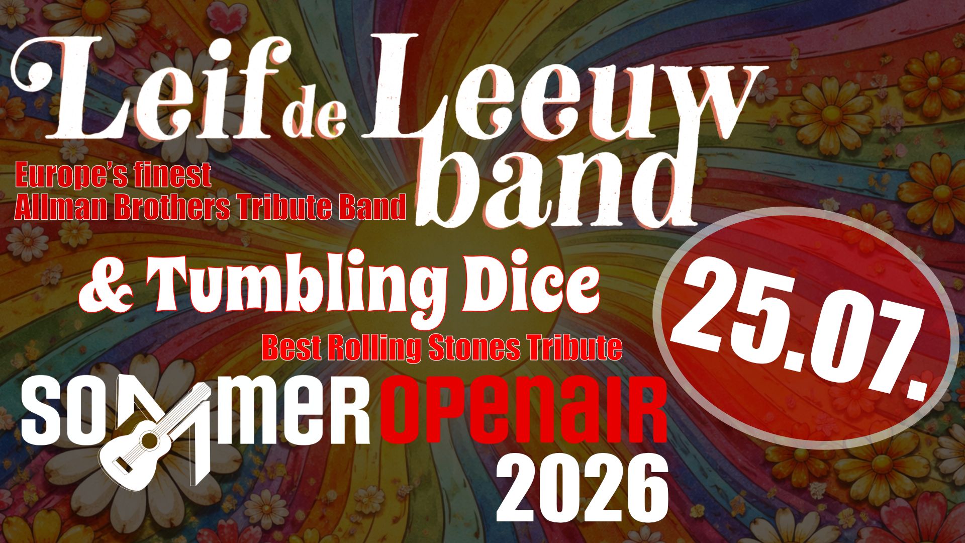 Wir haben für diesen Abend die Leif de Leeuw Band - Europas beste Allman Brothers Tribut Show engagieren können. Die sechsköpfige Band bietet eine Show voller mitreißender Gitarrensoli, zwei Schlagzeugen und explosiven Hammond-Sounds. Sie präsentieren die zeitlosen Hits der legendären Allman Brothers, aber auch eigene Songs. Ihr Sound ist eine gelungene Mischung aus Rock, Blues, Americana, Country und Southern Rock, gepaart mit gefühlvollen Texten und einem charmanten 70er-Jahre-Flair. Natürlich heißt es auch an diesem Abend wieder abrocken zu „Stones Tribute at its Best“ mit den Tumbling Dice, zu denen wir an dieser Stelle nicht viele Worte verlieren müssen.